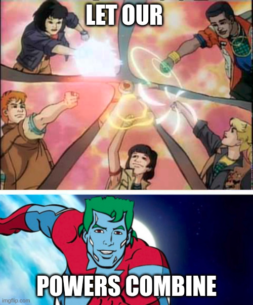 An image referencing the 1990s childrens’ TV program “Captain Planet”. Depicts the “planeteers” combining their powers to summon… Captain Planet!