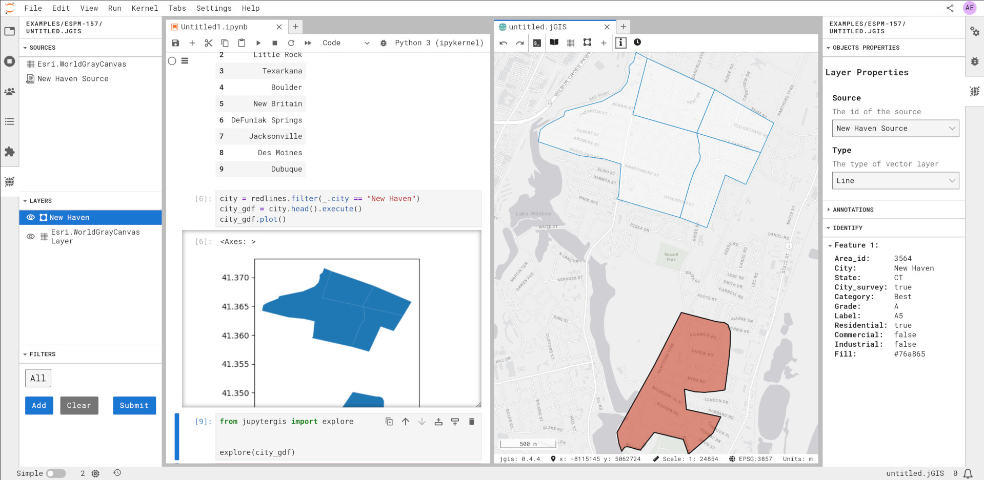 After writing this line of code, JupyterGIS would open in a new JupyterLab window with a basemap and the analysis output loaded as layers. JupyterGIS would then allow users to verify geolocation and validate feature attributes and grid cell values, all under one roof. After validating, users would have the option to save their JupyterGIS project for future reuse!